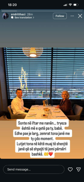 Endrit Thaçi, djali i ish-presidentit Hashim Thaçi, ka darkuar për iftar bashkë me nënë e tij, Lumnijen, profesoreshë universitare.