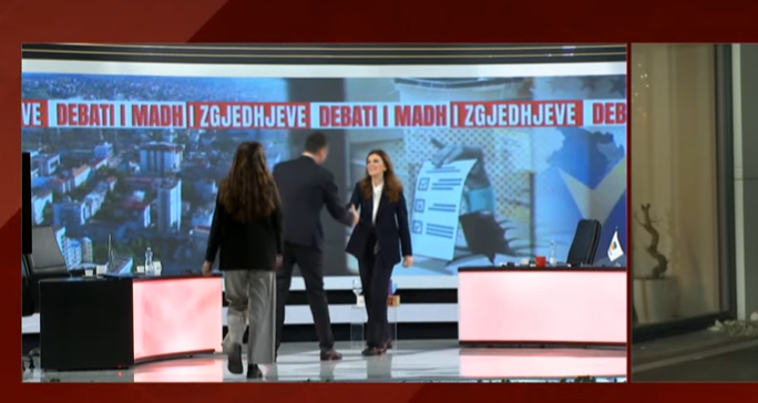 Glaul Konjufca, nënkryetar i LVV-së, dhe Vlora Çitaku, nënkryetare e PDK-së, kanë shtrënguar duart pak para fillimit të debatit në Kanal 10.
