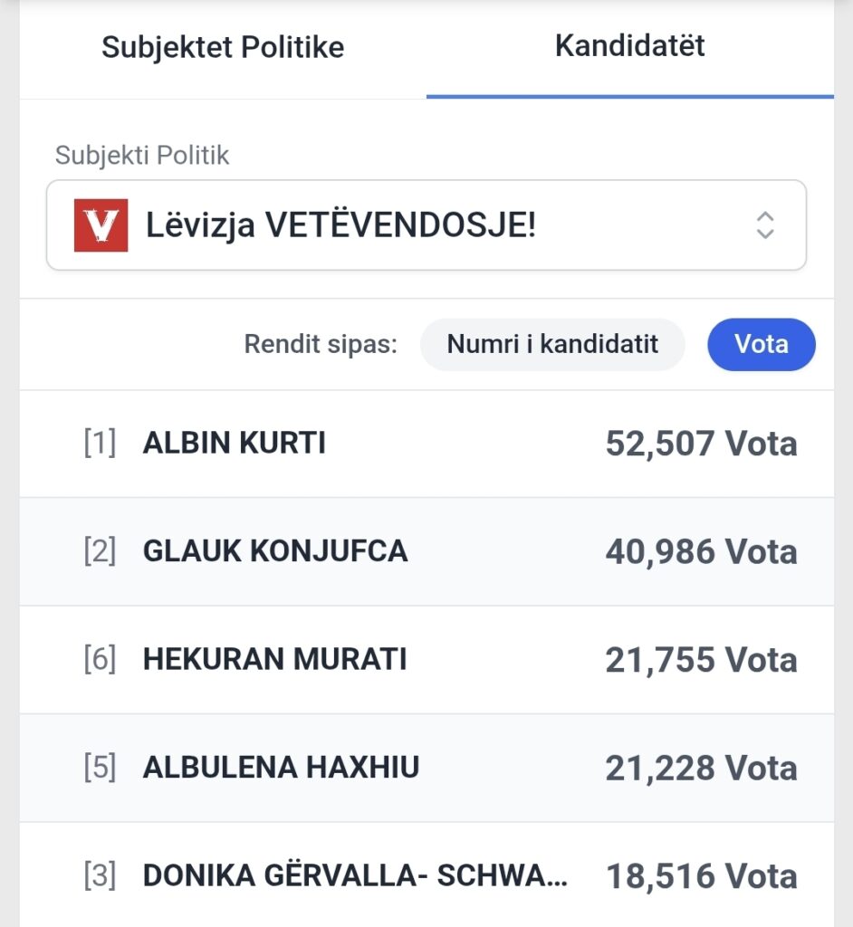 Sipas këtyre rezultateve në top pesë kandidatët më të votuar të VV-së është Albin Kurti, i cili është i pari në listë.