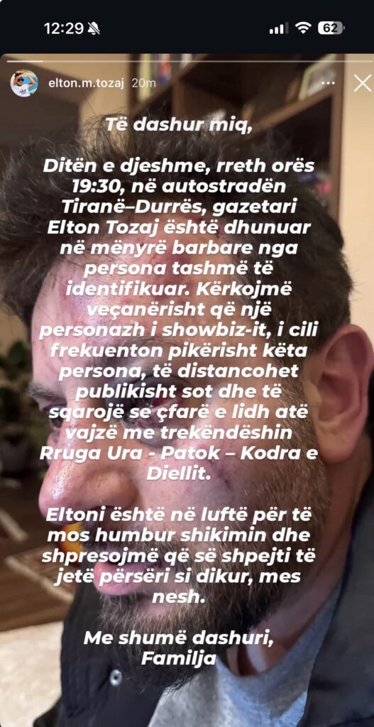 Pamjet e publikuara janë tronditëse, ku Tozaj shihet me dëmtime të shumta në fytyrë dhe në zonën e syve. Familjarët bëjnë të ditur se gjendja e tij është kritike, duke theksuar se gazetari ndodhet “në luftë për të mos humbur shikimin” si pasojë e goditjeve të marra.