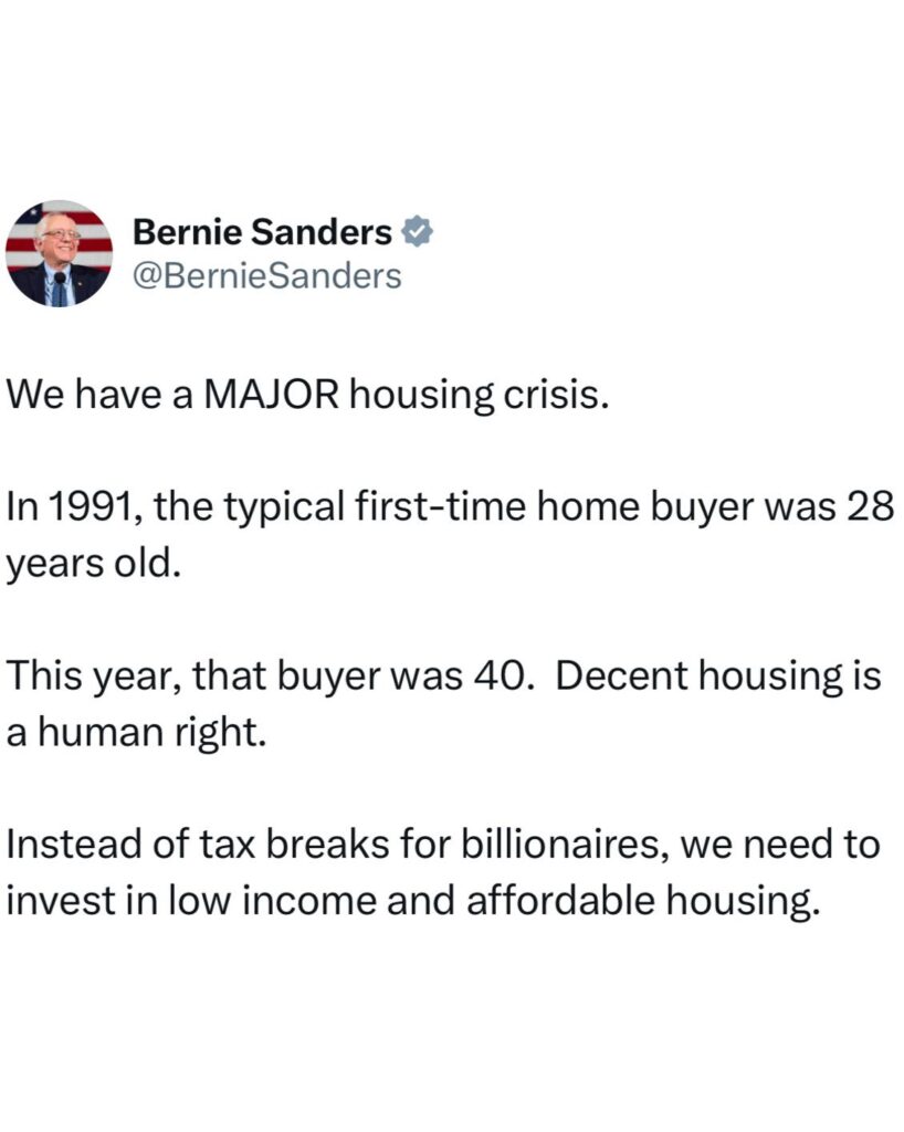 “Ne kemi një krizë MADHORE të strehimit. Strehimi i denjë është një e drejtë njerëzore,” shkruan Sanders, duke kritikuar politikat që, sipas tij, favorizojnë miliarderët përmes lehtësimeve fiskale.
